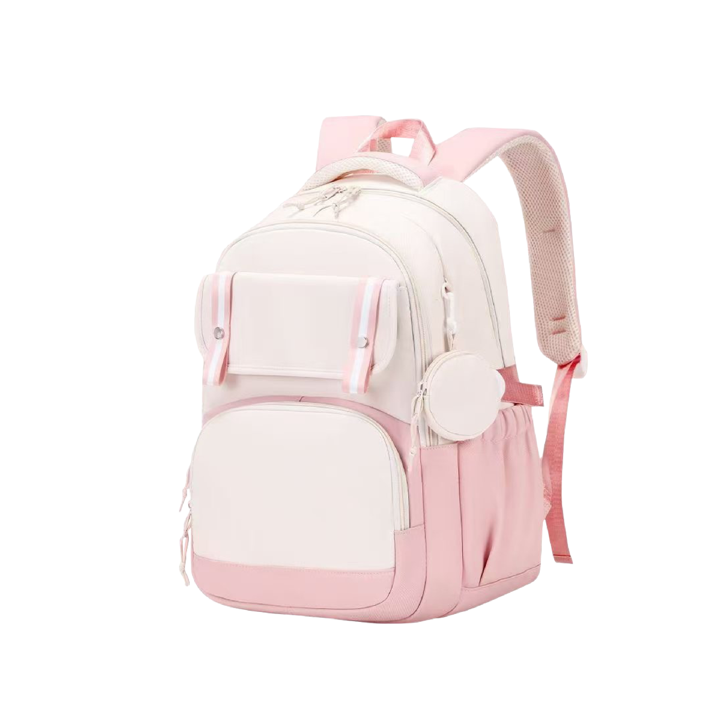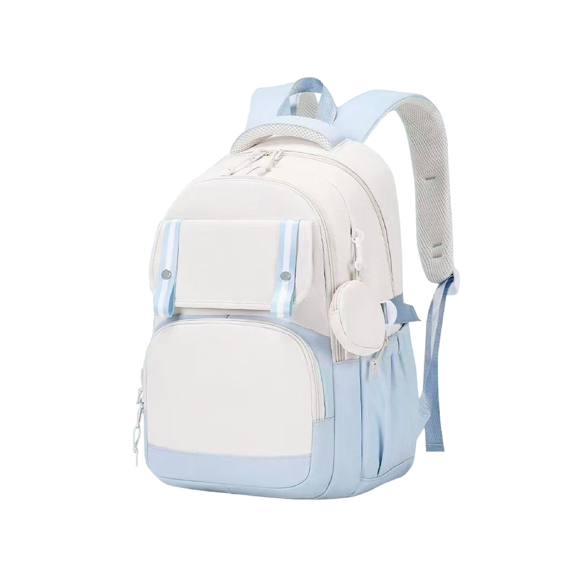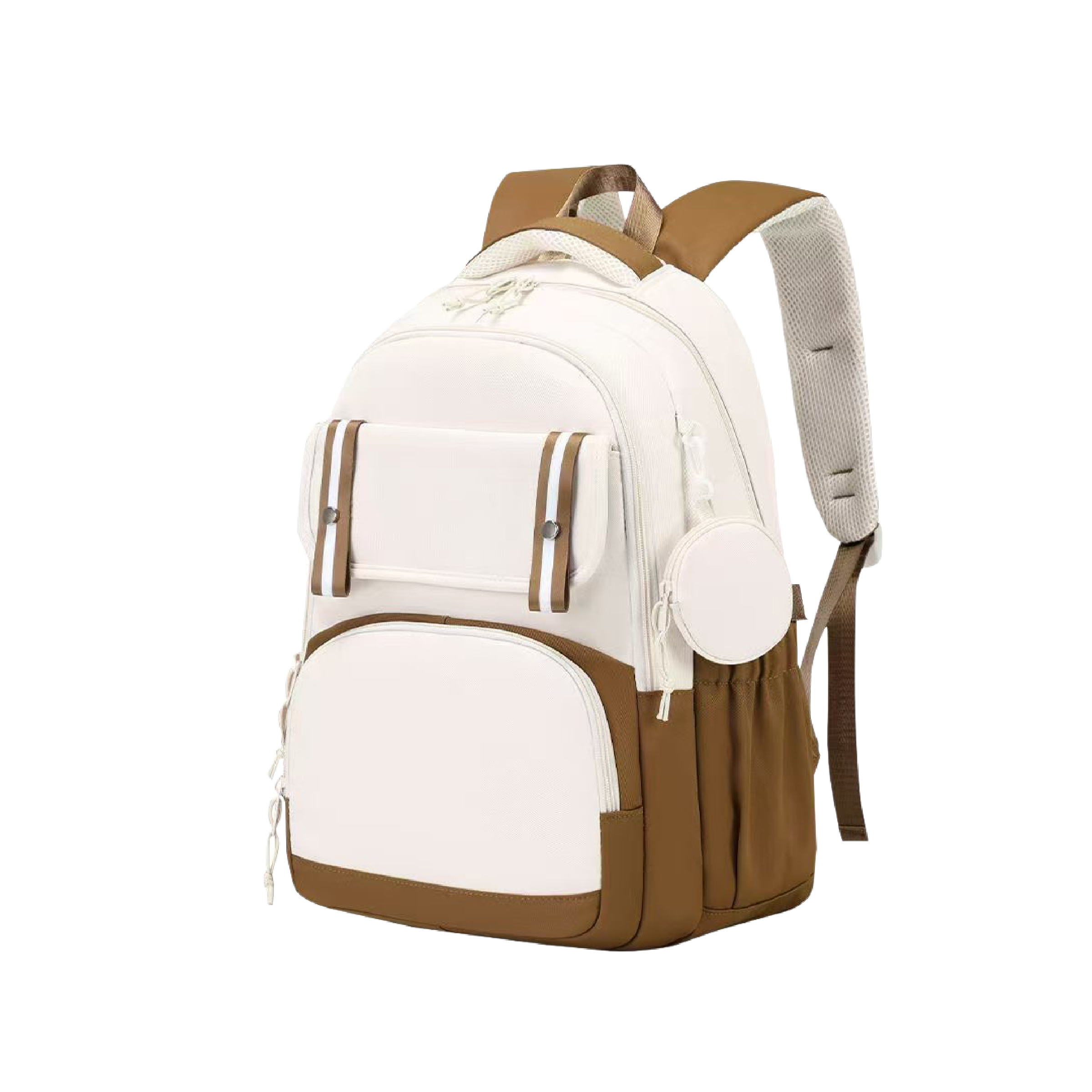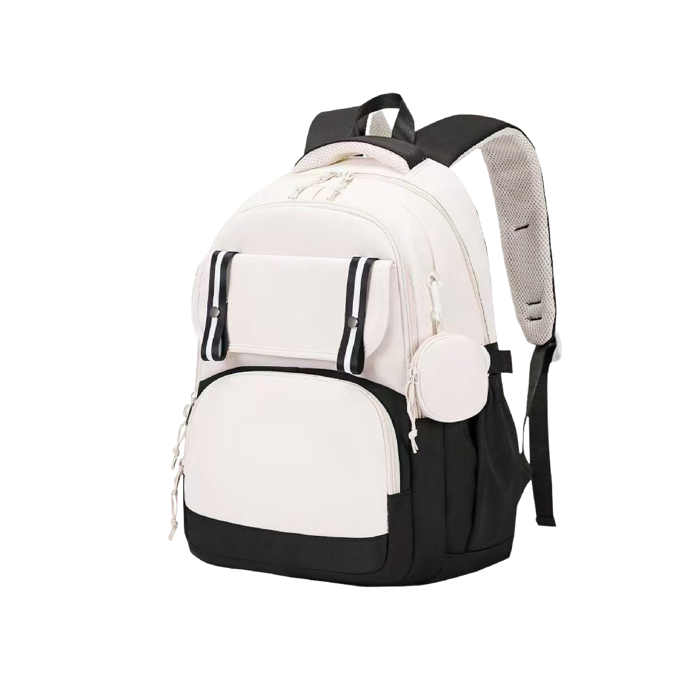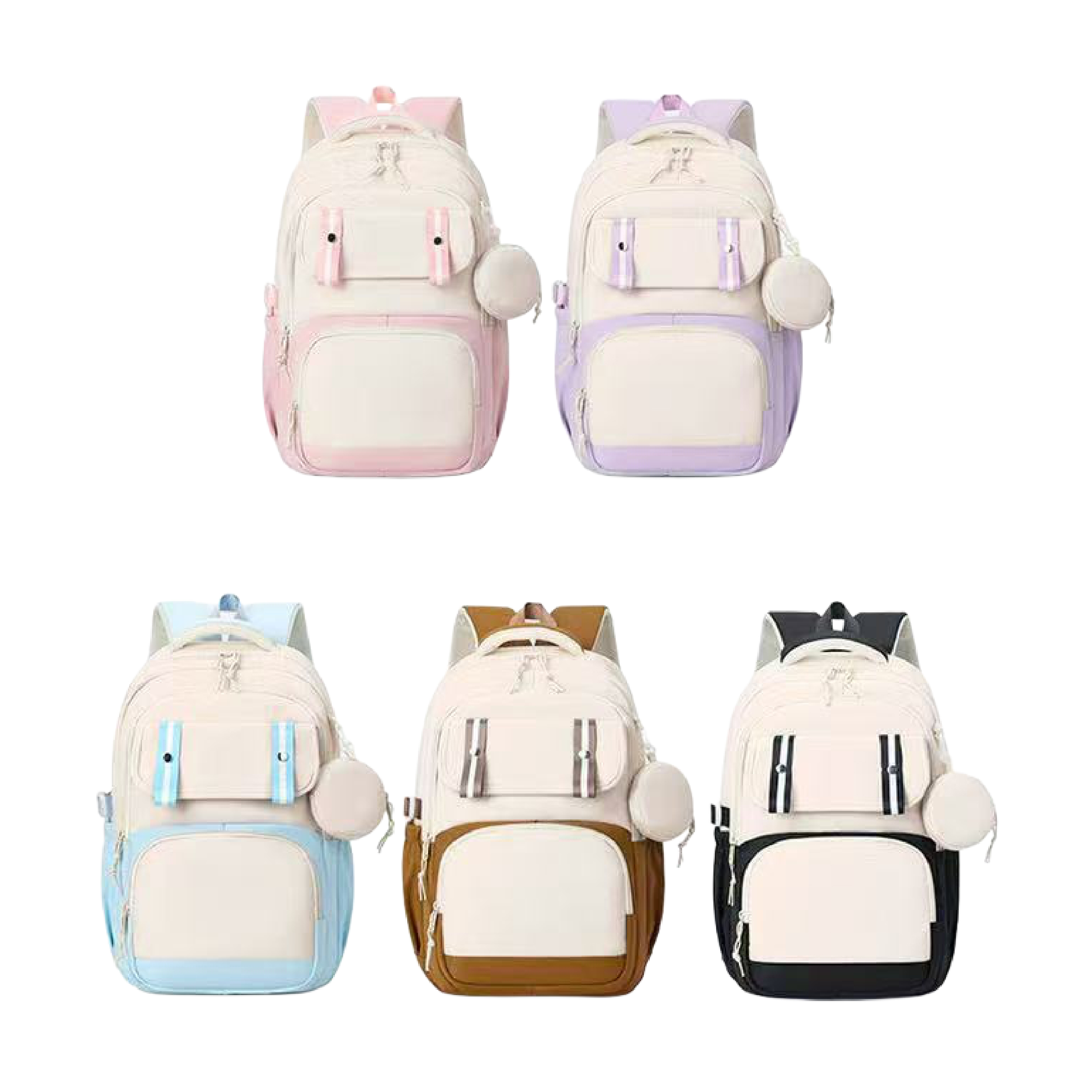 This backpack makes carrying your gear simple and stylish. The roomy design handles books, clothes, or a laptop without any hassle. Multiple pockets keep your stuff sorted so you never dig around for keys. The detachable pouch works great for earbuds, coins, or cards. The padded straps rest easy on your shoulders even when it's fully packed. The two tone look feels modern and matches both casual and school outfits. Take it to class, work, or a weekend trip without missing a beat. Durable and light, it keeps up with busy days in the city.